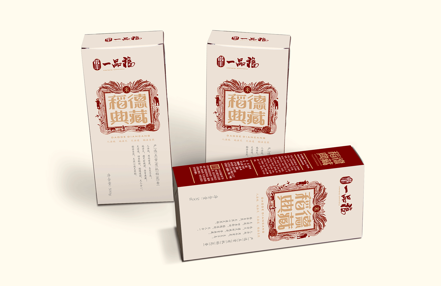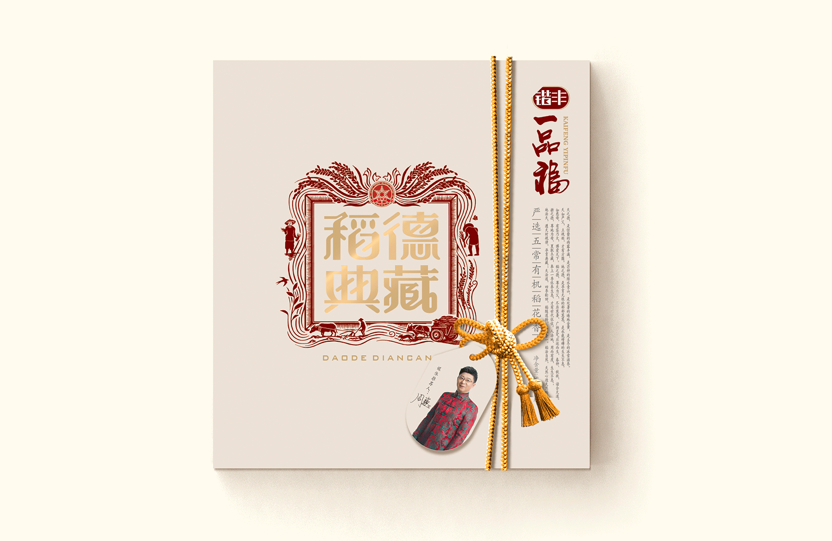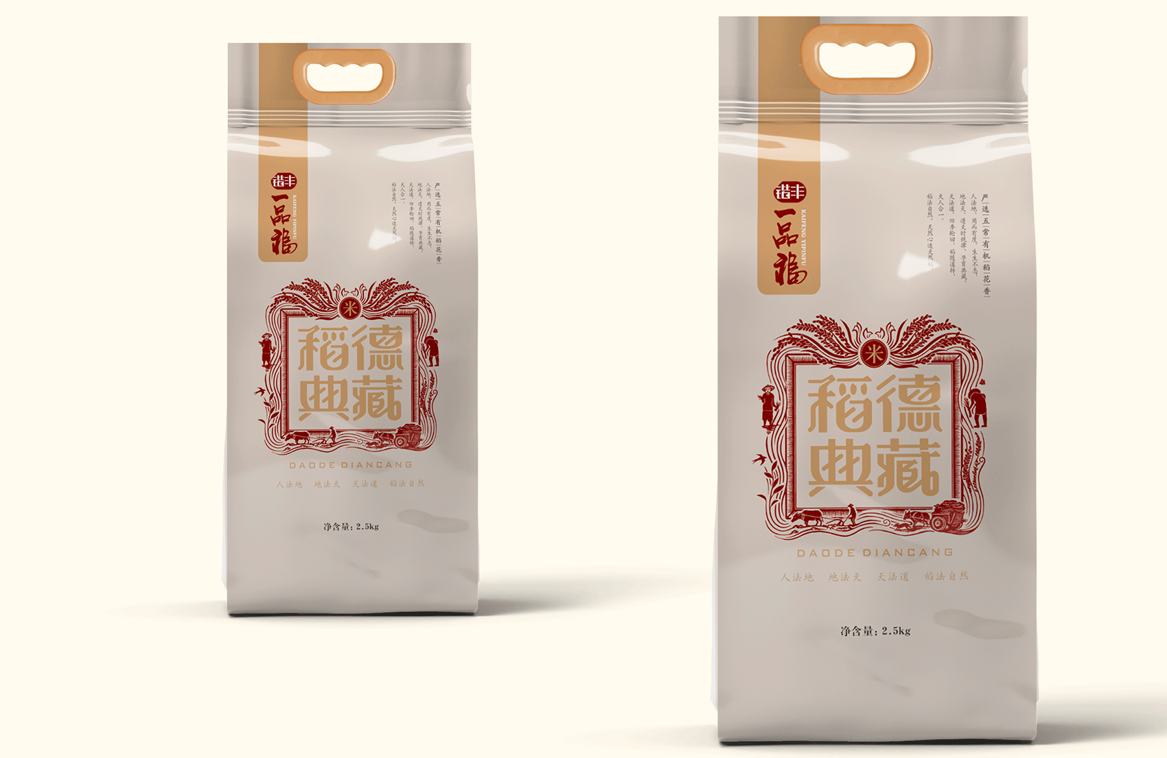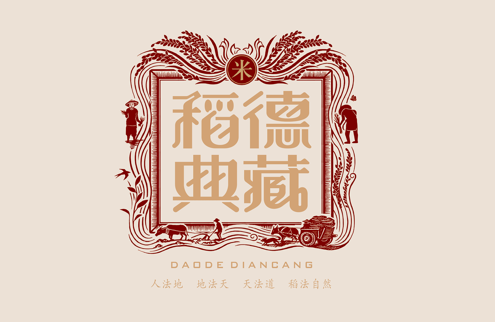稻德諧音道德,寓意企業(yè)堅(jiān)持對(duì)稻米品質(zhì)的堅(jiān)守與道德品質(zhì),其中典字寓意五常稻花香經(jīng)典產(chǎn)品,同時(shí)典源于《道德經(jīng)》,將品牌整體與《道德經(jīng)》的文化內(nèi)核進(jìn)行連接;在畫面表現(xiàn)上通過播種、插秧、耕作、收獲對(duì)應(yīng)四時(shí)節(jié)氣的不斷循環(huán),將遵循天道,自然而為的堅(jiān)守形象的表達(dá)出來。獎(jiǎng)狀的排版形式具有雙重寓意,一方面是對(duì)于辛勤耕作的農(nóng)人對(duì)于品質(zhì)的不斷追求的嘉獎(jiǎng),另一方面表達(dá)了品牌本身對(duì)于品質(zhì)的執(zhí)著追求。選用米色做主色調(diào),強(qiáng)調(diào)產(chǎn)品本真原味無添加的特性,配以具有厚重感的深紅提升了包裝的品質(zhì)感,稻德典藏四個(gè)字使用燙金工藝,更突顯產(chǎn)品的珍貴屬性,與典藏相合提升了包裝的價(jià)值感、品質(zhì)感,優(yōu)雅大氣,內(nèi)斂陳穩(wěn)。