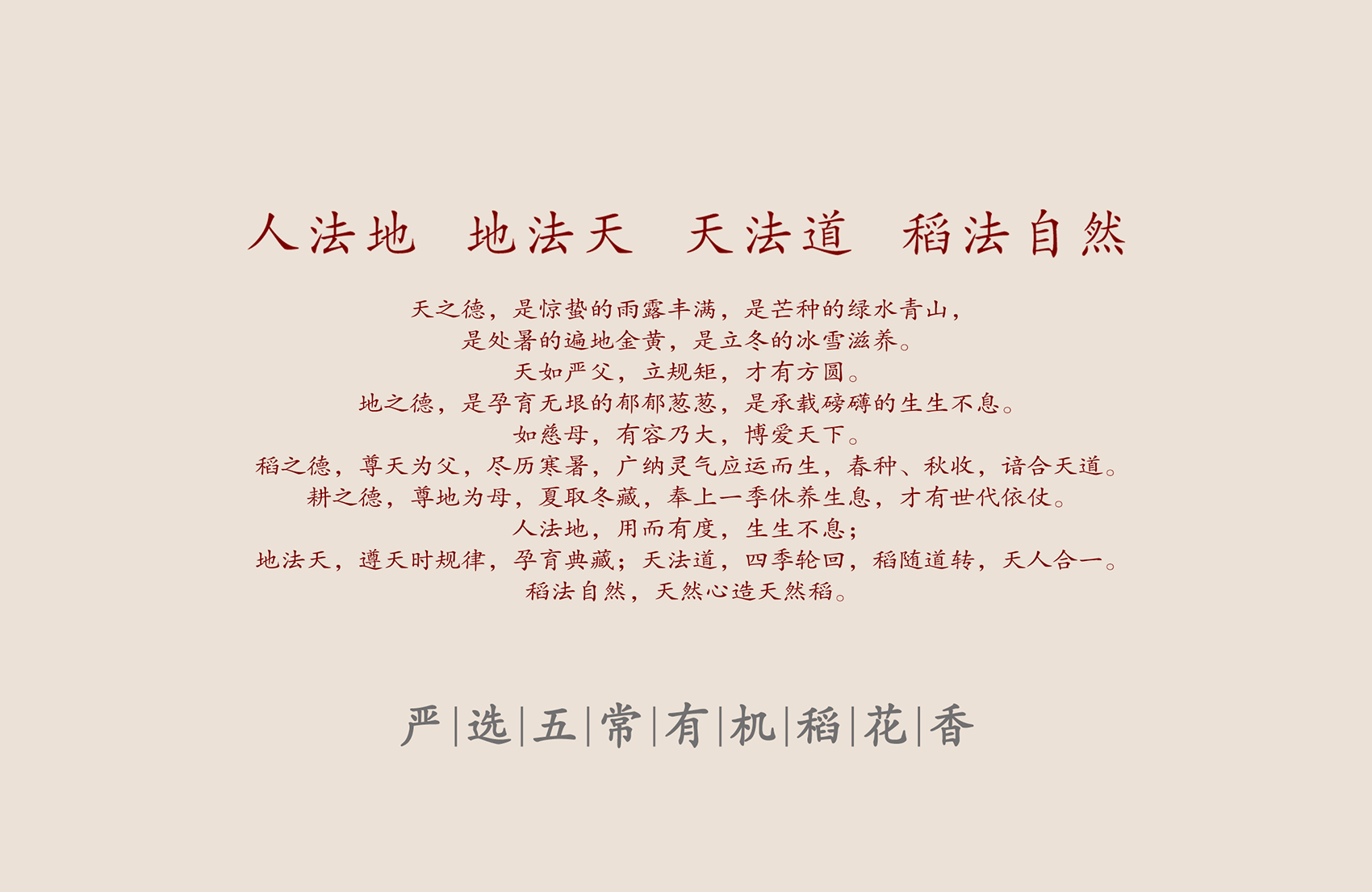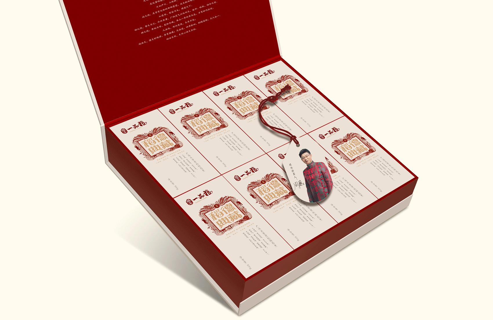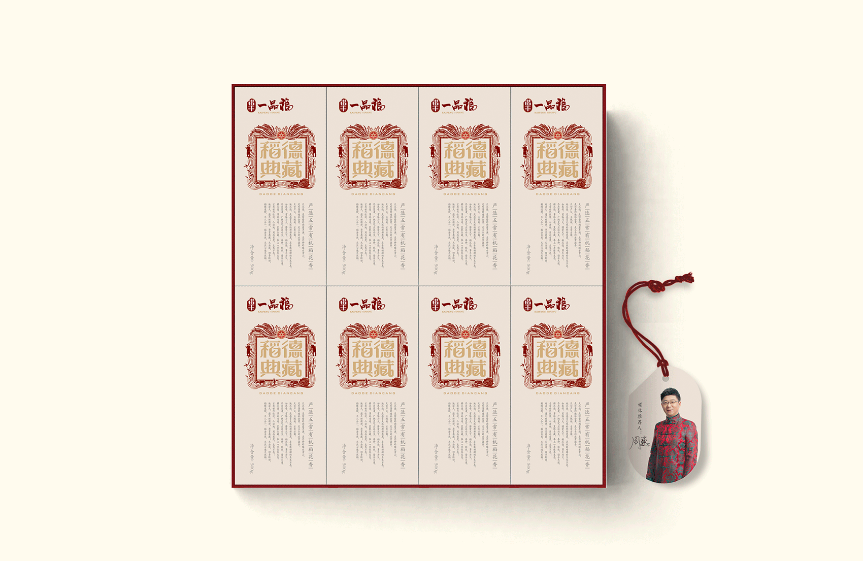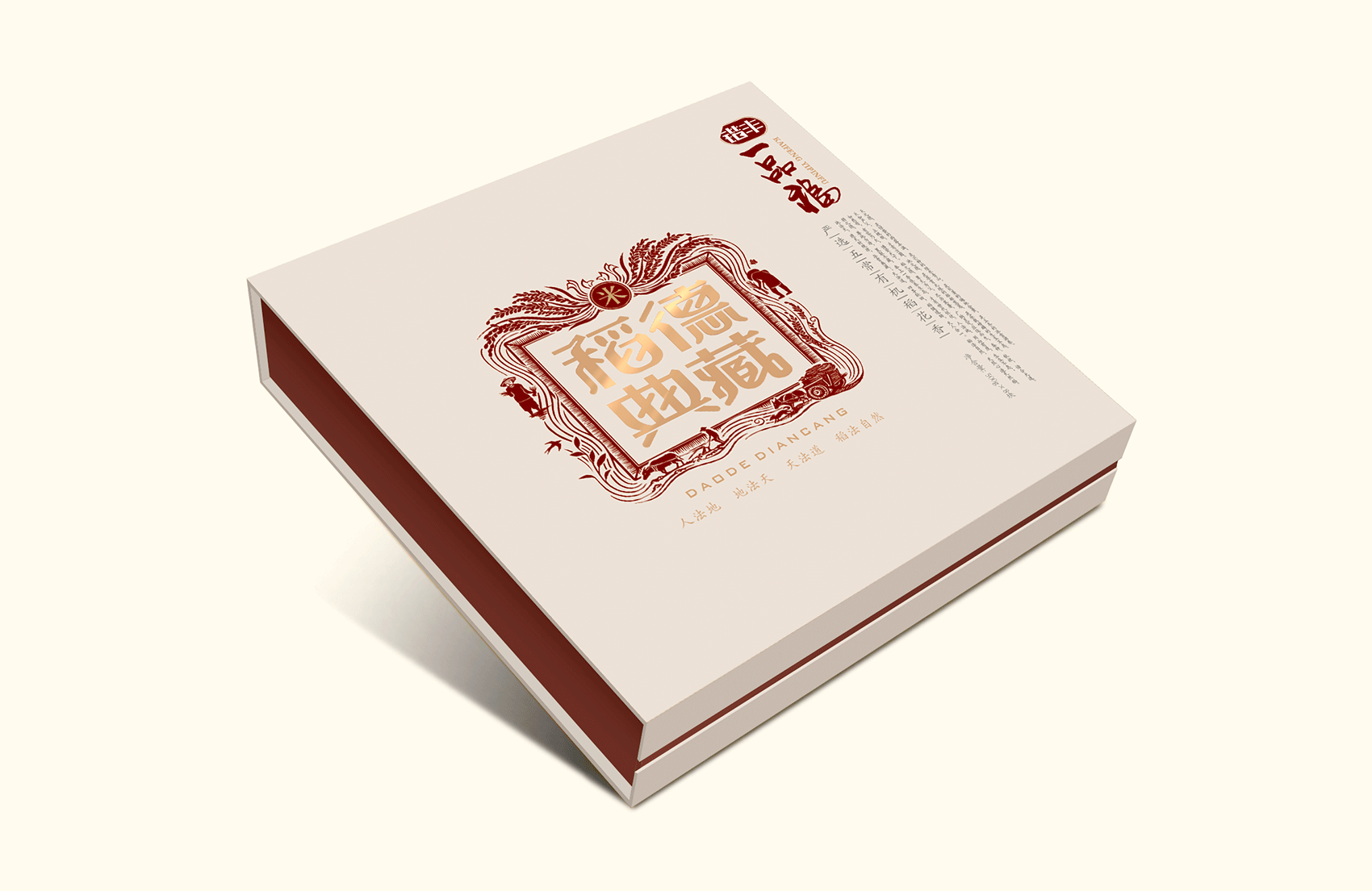 稻德諧音道德,寓意企業(yè)堅(jiān)持對(duì)稻米品質(zhì)的堅(jiān)守與道德品質(zhì),其中典字寓意五常稻花香經(jīng)典產(chǎn)品,同時(shí)典源于《道德經(jīng)》,將品牌整體與《道德經(jīng)》的文化內(nèi)核進(jìn)行連接;在畫面表現(xiàn)上通過播種、插秧、耕作、收獲對(duì)應(yīng)四時(shí)節(jié)氣的不斷循環(huán),將遵循天道,自然而為的堅(jiān)守形象的表達(dá)出來。獎(jiǎng)狀的排版形式具有雙重寓意,一方面是對(duì)于辛勤耕作的農(nóng)人對(duì)于品質(zhì)的不斷追求的嘉獎(jiǎng),另一方面表達(dá)了品牌本身對(duì)于品質(zhì)的執(zhí)著追求。選用米色做主色調(diào),強(qiáng)調(diào)產(chǎn)品本真原味無添加的特性,配以具有厚重感的深紅提升了包裝的品質(zhì)感,稻德典藏四個(gè)字使用燙金工藝,更突顯產(chǎn)品的珍貴屬性,與典藏相合提升了包裝的價(jià)值感、品質(zhì)感,優(yōu)雅大氣,內(nèi)斂陳穩(wěn)。