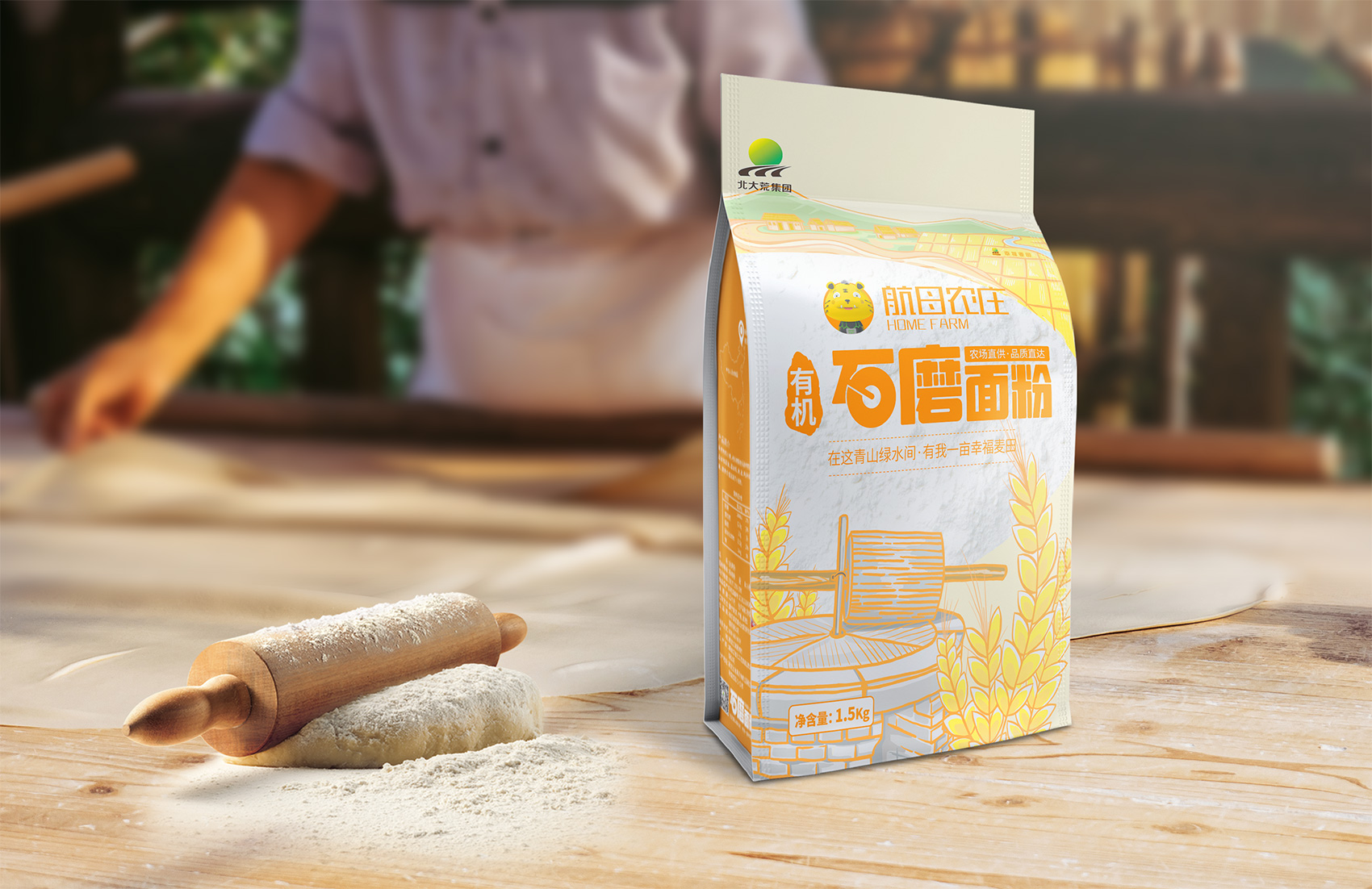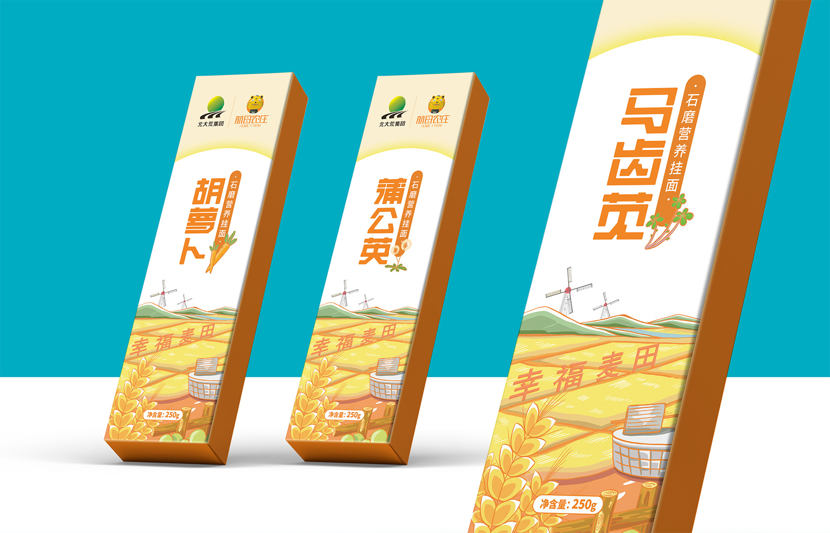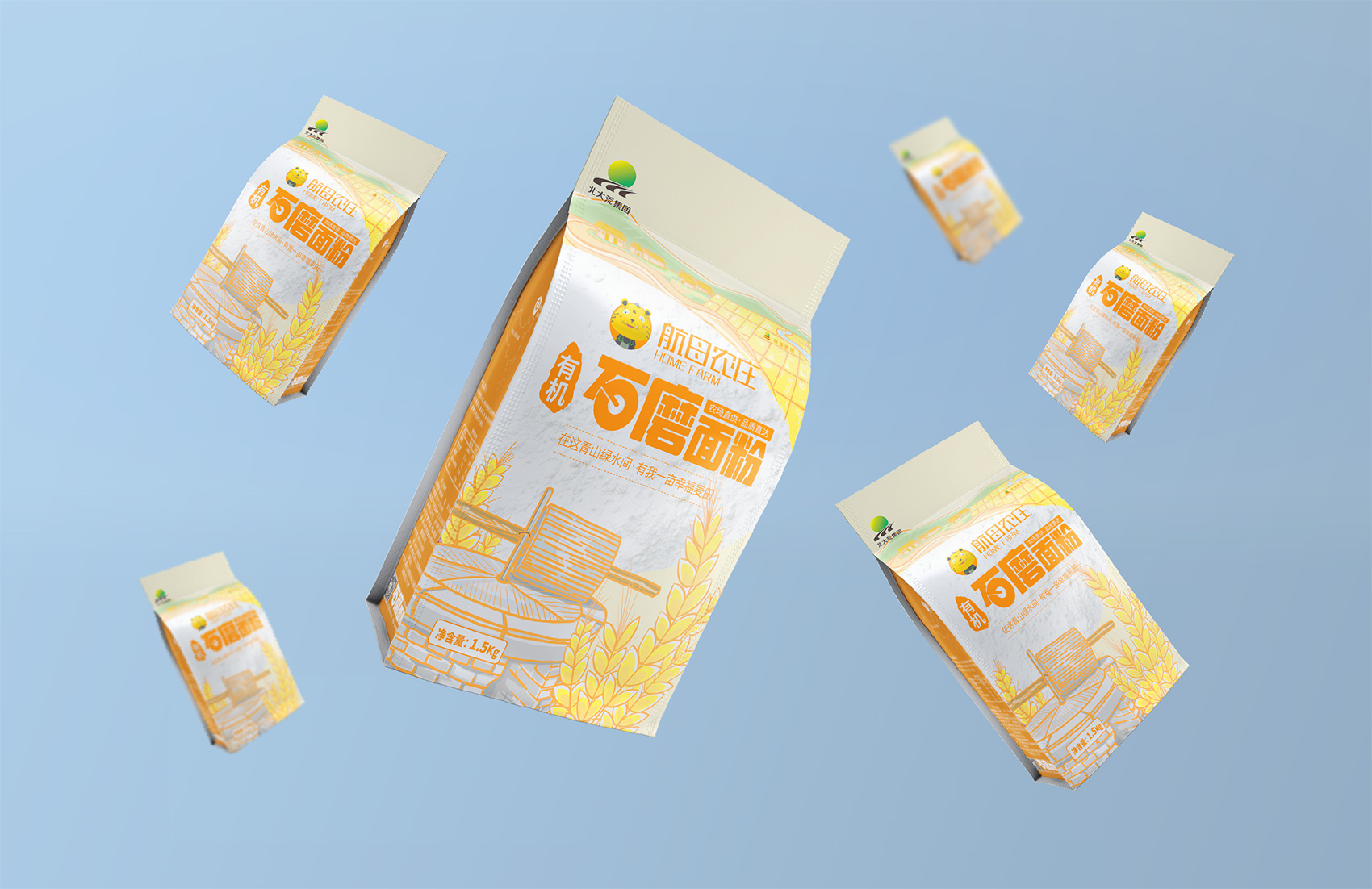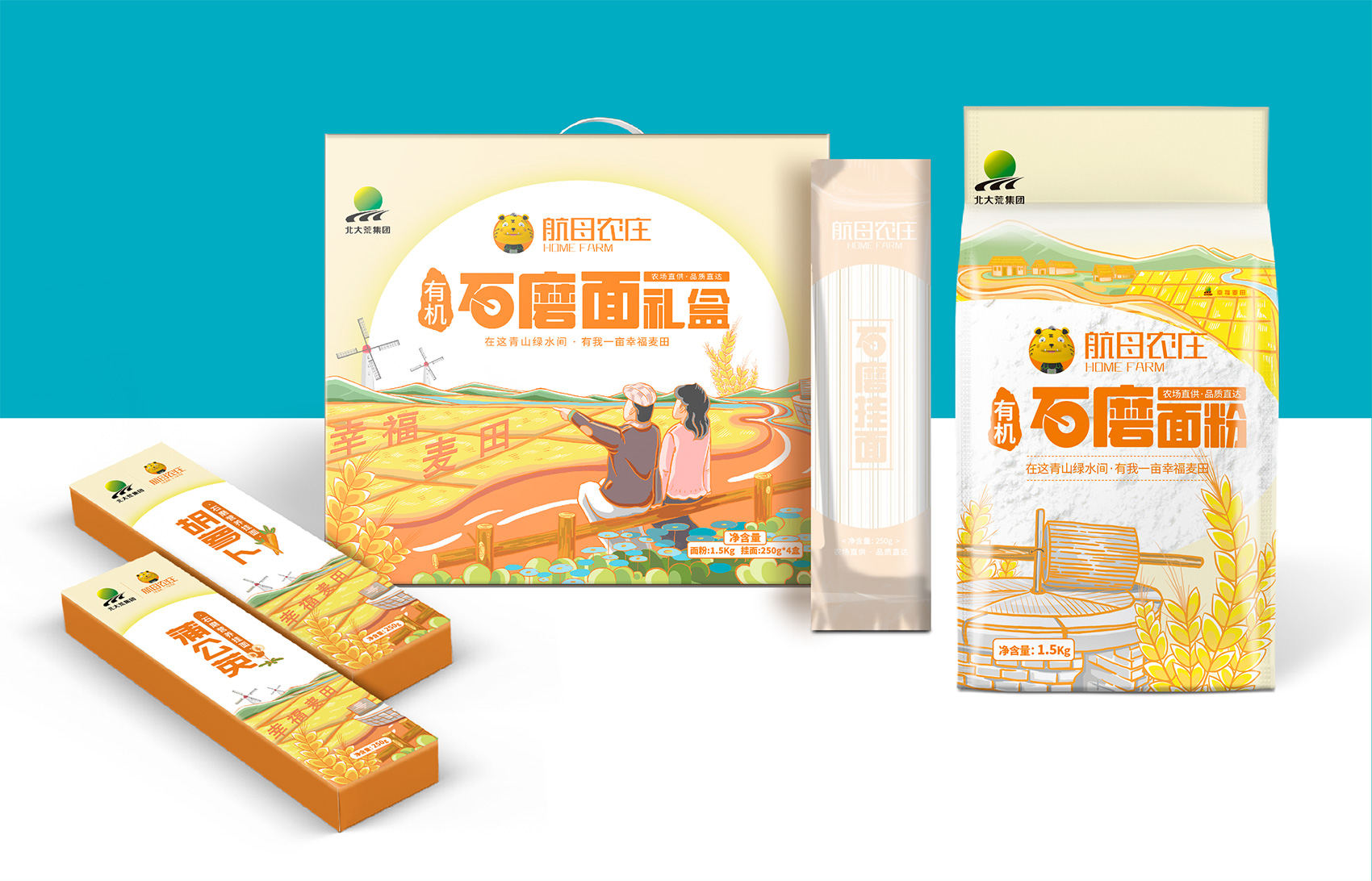 石磨面粉的產(chǎn)地位于有著“小江南”的建邊農(nóng)場,產(chǎn)品使用傳統(tǒng)石磨加工,在低溫狀態(tài)下研磨面粉,使得面粉中的大部分營養(yǎng)成分得以保留,而這種慢工出細活的生產(chǎn)方式造就了產(chǎn)品的優(yōu)良品質(zhì),也與品牌提倡的綠色生活相呼應(yīng),繽策將這種慢生活的品牌內(nèi)核通過手繪插畫進行表達,將攜手相依在夕陽下,遙望燦爛金黃的麥浪翻滾,在周圍青山綠水的環(huán)繞下的幸福場景,色彩飽滿穩(wěn)重,筆觸細膩,讓人浮想聯(lián)翩,仿佛麥香撲面而來。