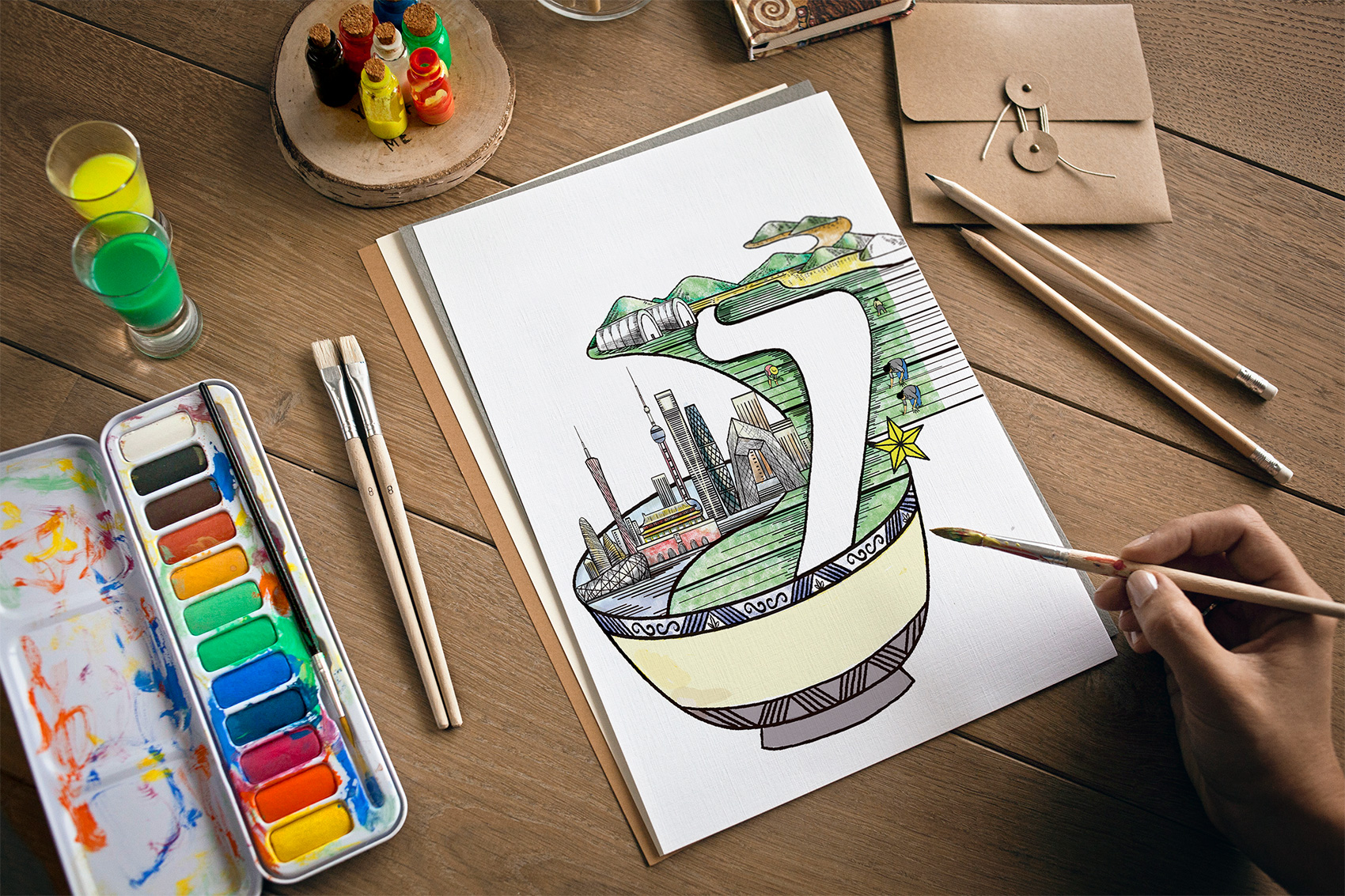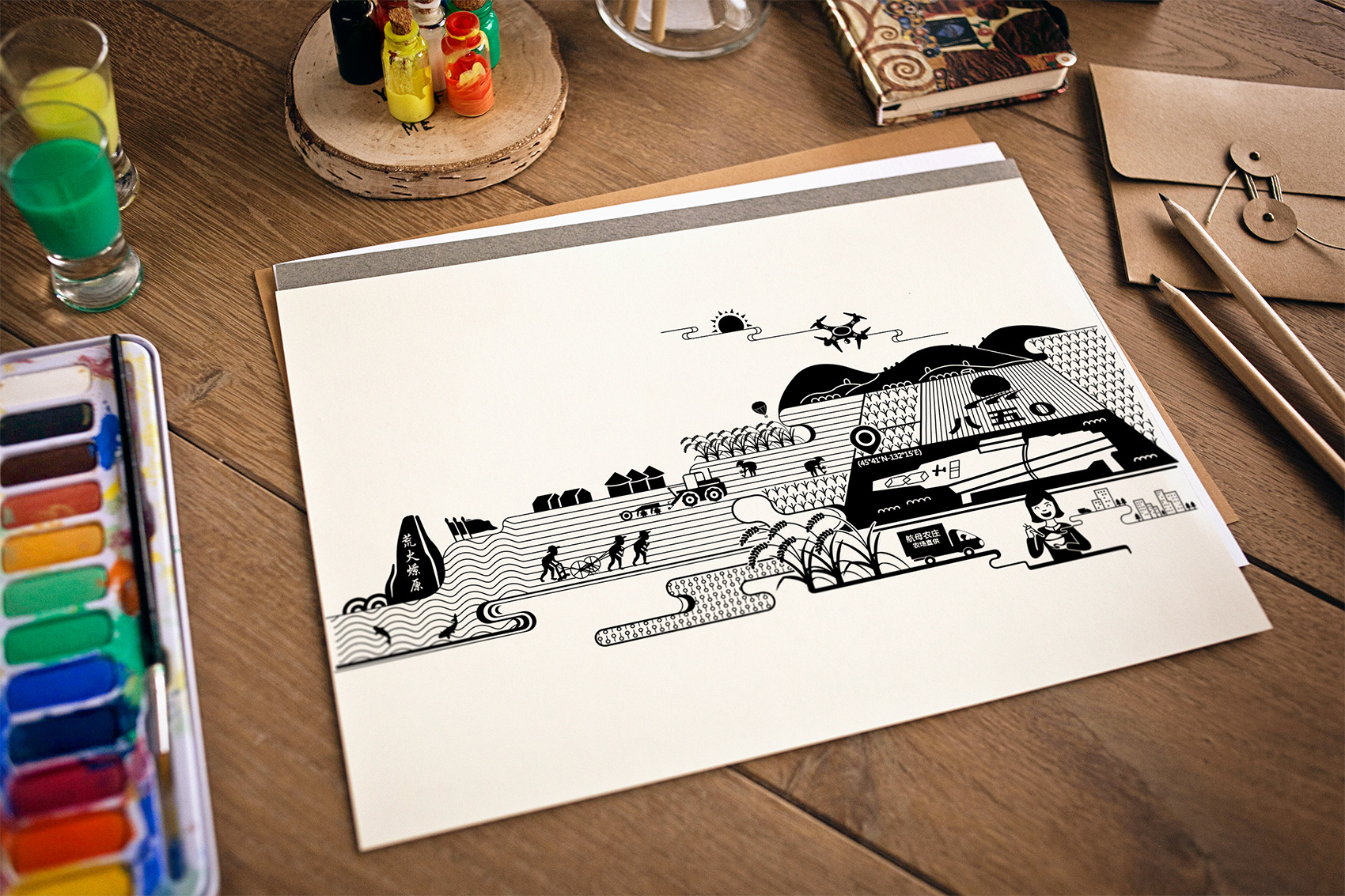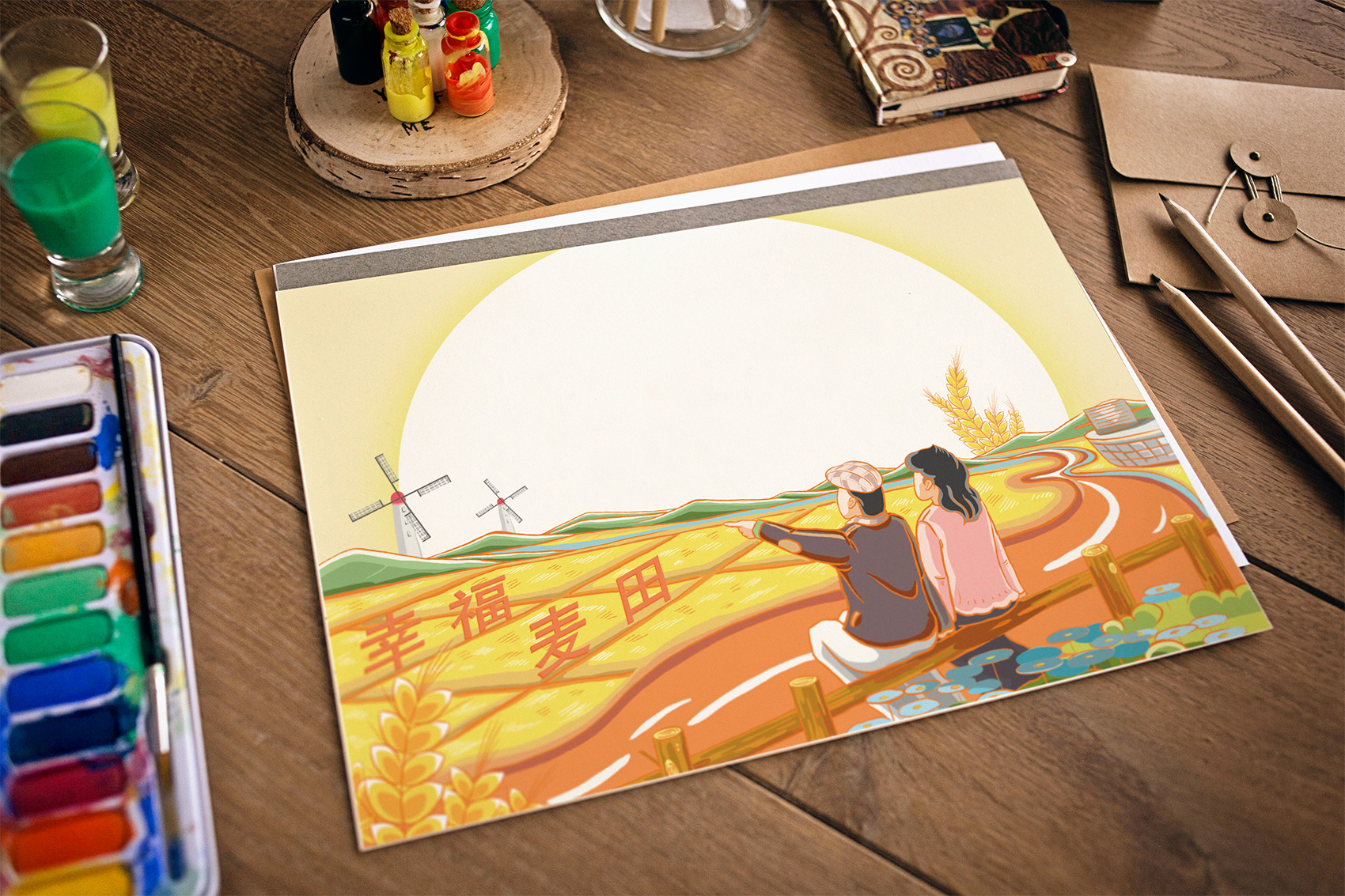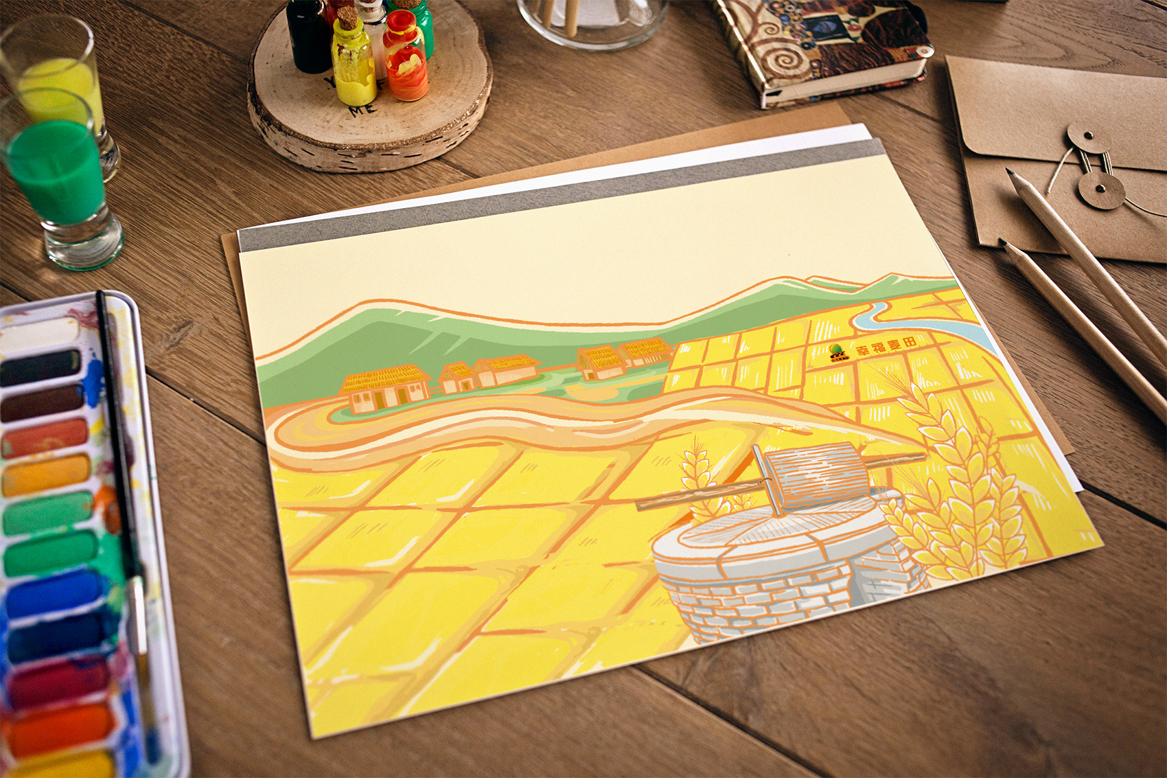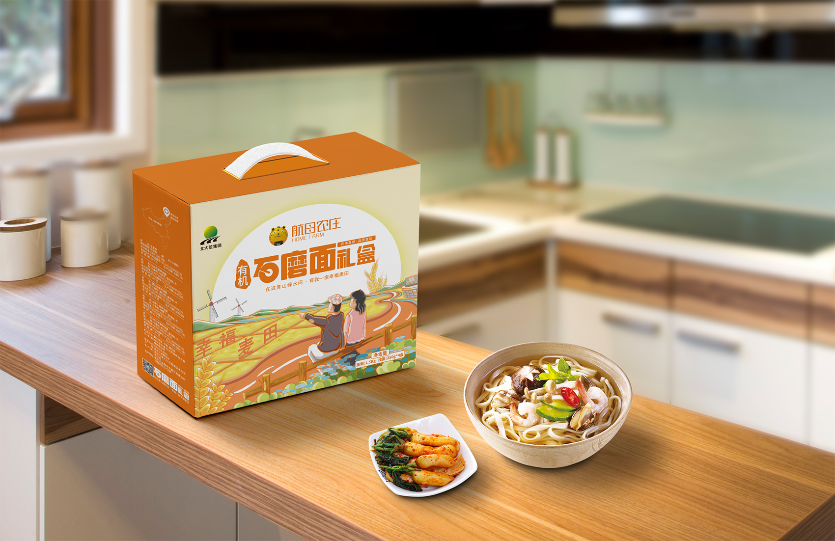 石磨面粉的產(chǎn)地位于有著“小江南”的建邊農(nóng)場,產(chǎn)品使用傳統(tǒng)石磨加工,在低溫狀態(tài)下研磨面粉,使得面粉中的大部分營養(yǎng)成分得以保留,而這種慢工出細活的生產(chǎn)方式造就了產(chǎn)品的優(yōu)良品質(zhì),也與品牌提倡的綠色生活相呼應(yīng),繽策將這種慢生活的品牌內(nèi)核通過手繪插畫進行表達,將攜手相依在夕陽下,遙望燦爛金黃的麥浪翻滾,在周圍青山綠水的環(huán)繞下的幸福場景,色彩飽滿穩(wěn)重,筆觸細膩,讓人浮想聯(lián)翩,仿佛麥香撲面而來。
