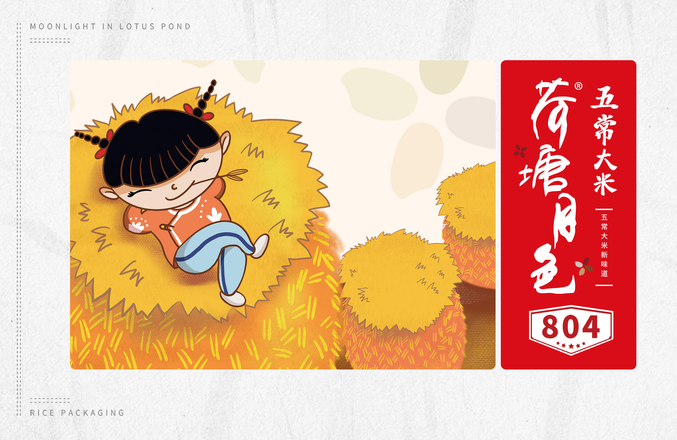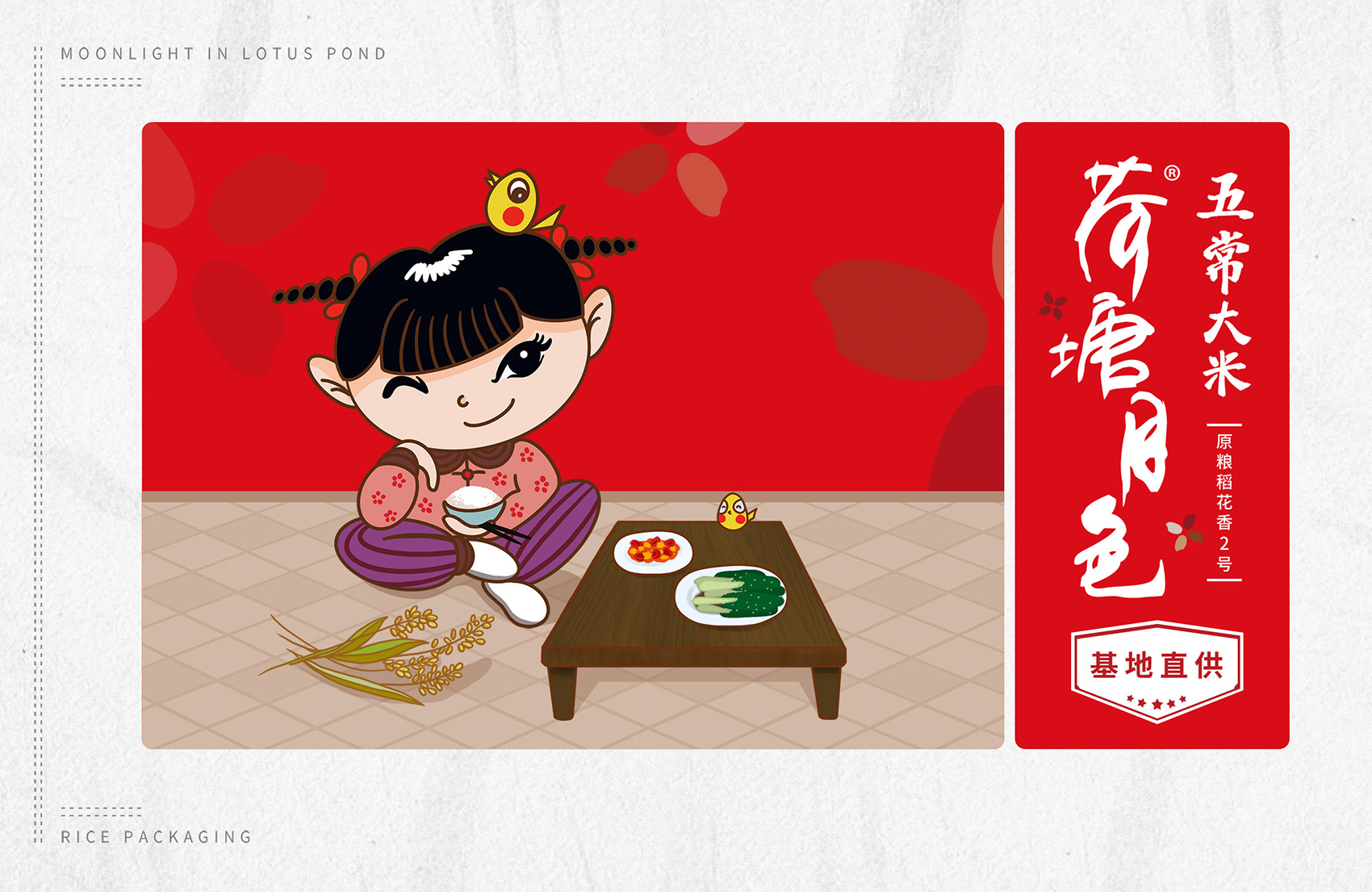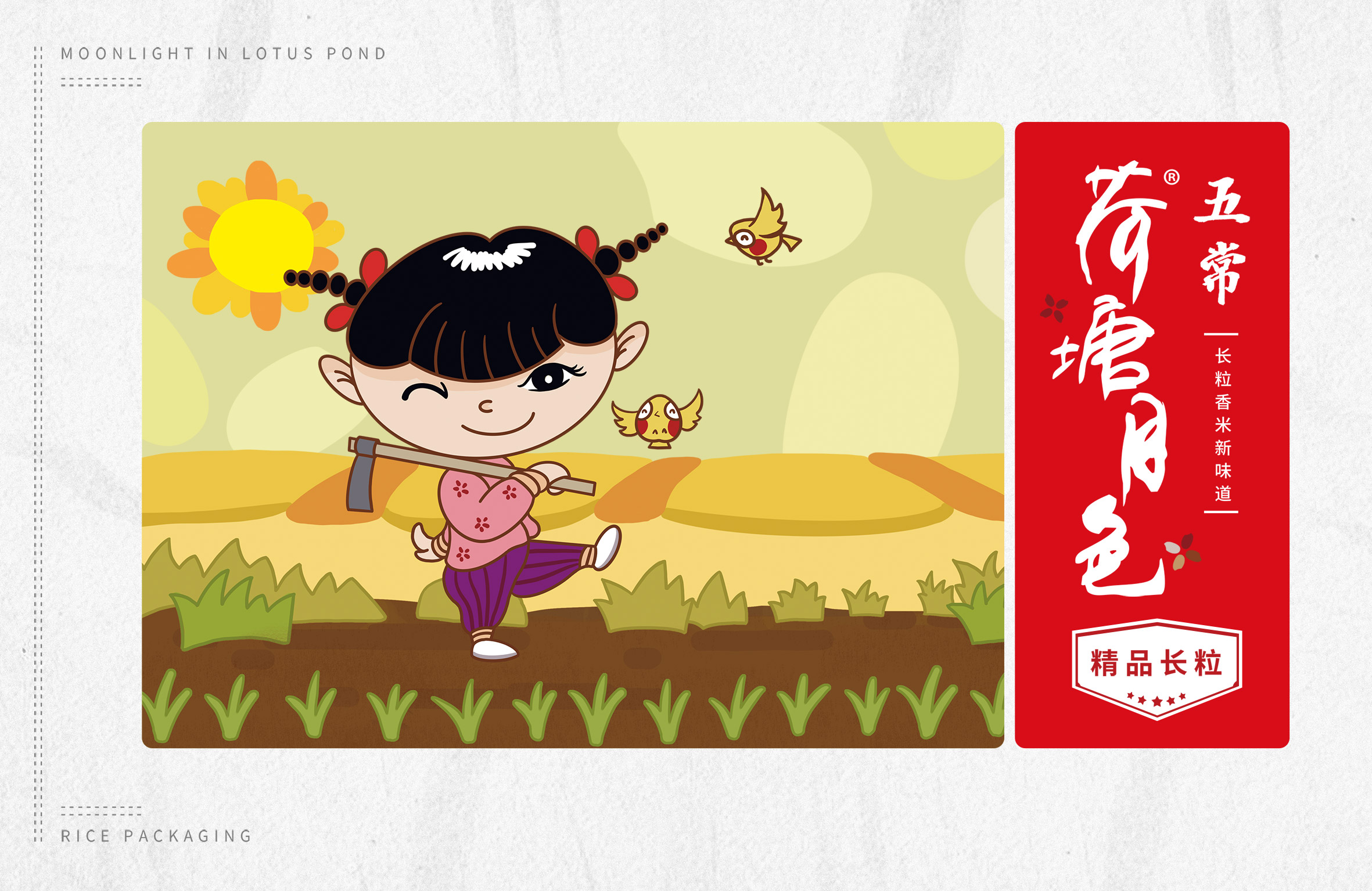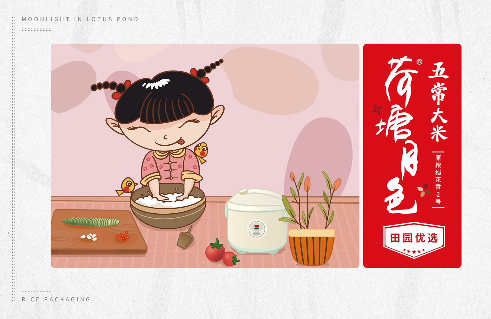 繽策通過與企業(yè)深入的會(huì)談與實(shí)地考察及調(diào)研,以及對(duì)市場(chǎng)對(duì)了解及經(jīng)驗(yàn)。為了讓更多的消費(fèi)者快速了解品牌所傳遞的核心價(jià)值,創(chuàng)意圍繞IP進(jìn)行,品牌IP化是不可阻擋的趨勢(shì),IP形象生動(dòng)有趣,后期可延展出VI、包裝、微視頻等多種宣傳方式,同時(shí)IP也可以有效的統(tǒng)領(lǐng)包裝風(fēng)格,輕松形成套系感,有效的解決包裝零散的問題;設(shè)計(jì)風(fēng)格定義鄉(xiāng)土氣息濃厚的卡通風(fēng)格,色彩上選取了水稻自然成熟的風(fēng)格,豐收的金色、質(zhì)樸的大地之色與傳統(tǒng)中代表吉祥與喜悅的紅色,給人以踏實(shí)可信賴之感,有效的拉近品牌與消費(fèi)者的距離。在畫面上將IP至于鄉(xiāng)下的生活場(chǎng)景中,除草、收割、淘米、吃飯,更具有真實(shí)感,配合討喜的鄉(xiāng)村丫頭形象,讓消費(fèi)者通過包裝聯(lián)想到鄉(xiāng)下自然閑適的田園生活,引起更多共鳴,獲得消費(fèi)者在情感層面上更多的認(rèn)同。