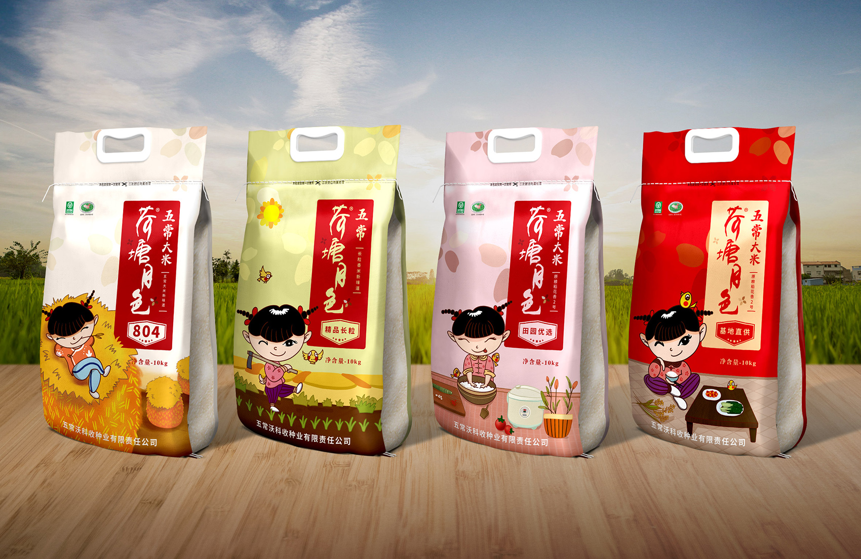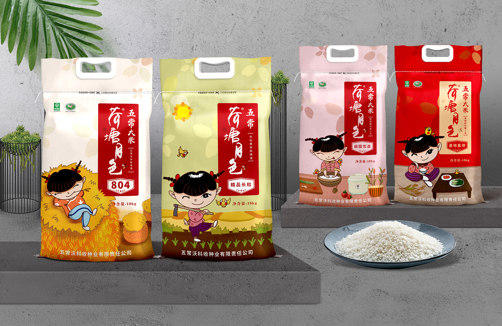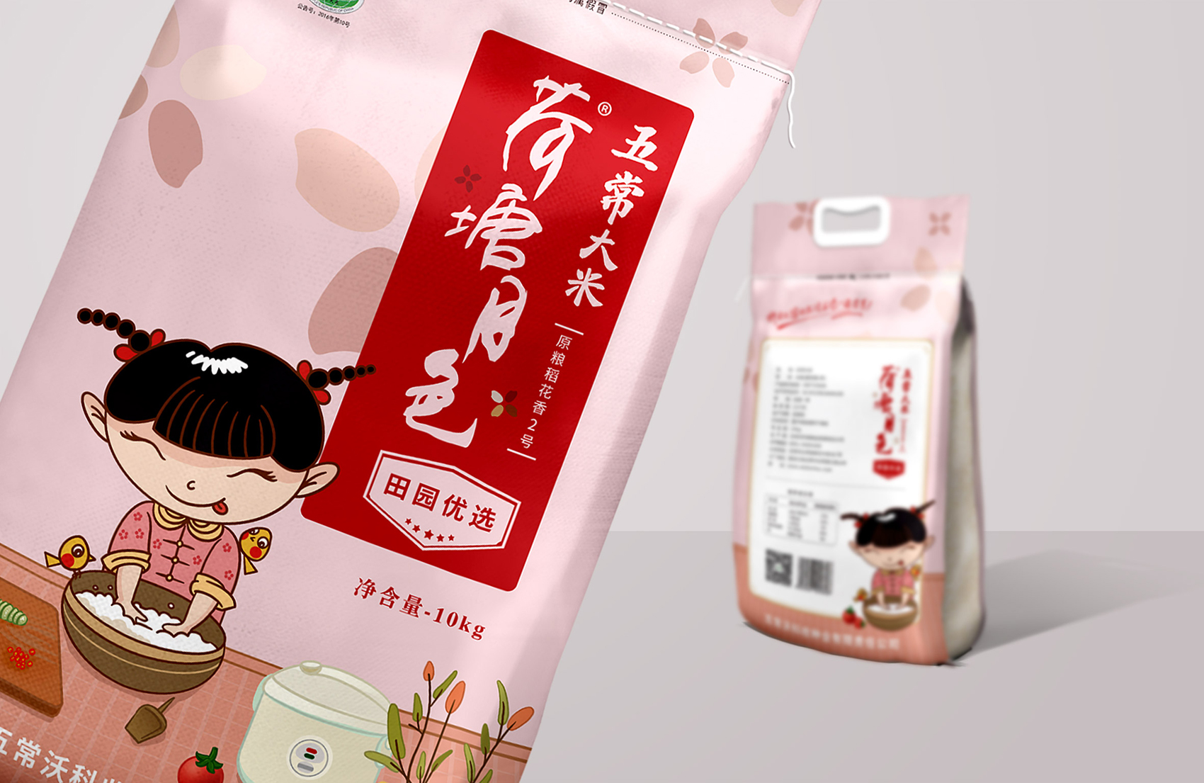 繽策通過與企業(yè)深入的會(huì)談與實(shí)地考察及調(diào)研,以及對(duì)市場(chǎng)對(duì)了解及經(jīng)驗(yàn)。為了讓更多的消費(fèi)者快速了解品牌所傳遞的核心價(jià)值,創(chuàng)意圍繞IP進(jìn)行,品牌IP化是不可阻擋的趨勢(shì),IP形象生動(dòng)有趣,后期可延展出VI、包裝、微視頻等多種宣傳方式,同時(shí)IP也可以有效的統(tǒng)領(lǐng)包裝風(fēng)格,輕松形成套系感,有效的解決包裝零散的問題;設(shè)計(jì)風(fēng)格定義鄉(xiāng)土氣息濃厚的卡通風(fēng)格,色彩上選取了水稻自然成熟的風(fēng)格,豐收的金色、質(zhì)樸的大地之色與傳統(tǒng)中代表吉祥與喜悅的紅色,給人以踏實(shí)可信賴之感,有效的拉近品牌與消費(fèi)者的距離。在畫面上將IP至于鄉(xiāng)下的生活場(chǎng)景中,除草、收割、淘米、吃飯,更具有真實(shí)感,配合討喜的鄉(xiāng)村丫頭形象,讓消費(fèi)者通過包裝聯(lián)想到鄉(xiāng)下自然閑適的田園生活,引起更多共鳴,獲得消費(fèi)者在情感層面上更多的認(rèn)同。